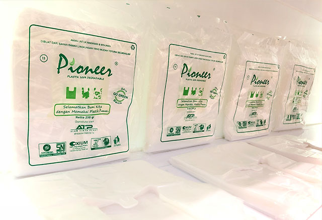Kantong plastik yang ramah lingkungan. Plastik ini dapat terurai kembali ke tanah, dimakan oleh microba dalam jangka waktu yang pendek (tidak hanya ter-fragmentasi menjadi mikroplastik tetapi juga terdegradasi molekulnya secara kimiawi), namun tetap aman untuk makanan dan minuman (food grade)